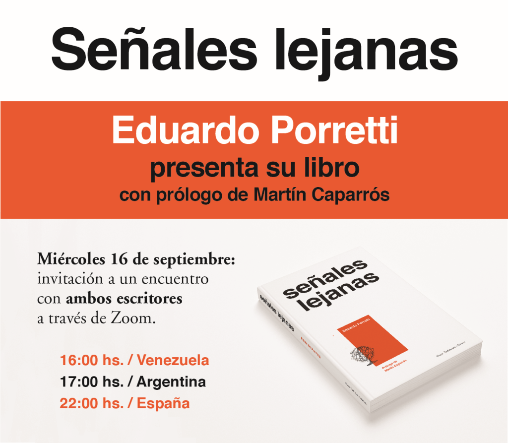 El próximo miércoles 16 de septiembre presentaré mi nuevo libro Señales lejanas en un encuentro virtual por Zoom junto al prologuista de la obra y eximio autor argentino Martín Caparrós.